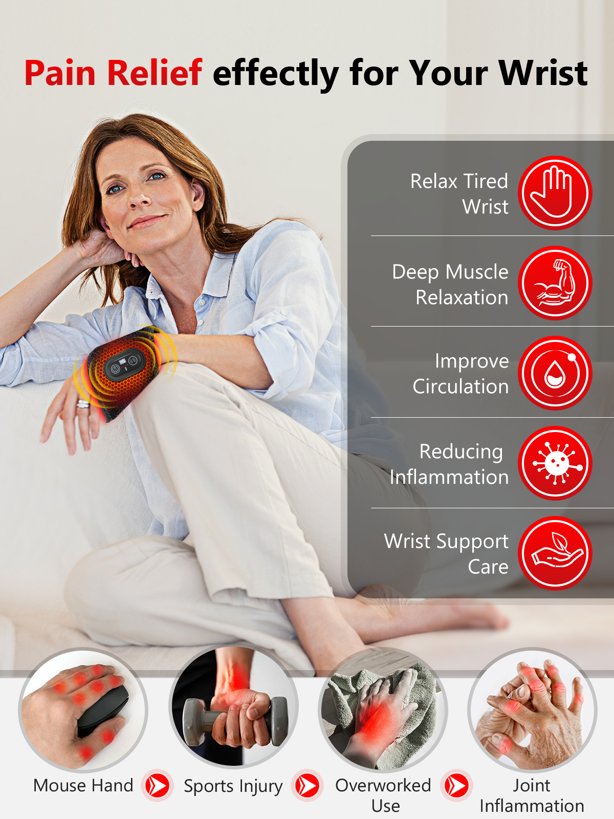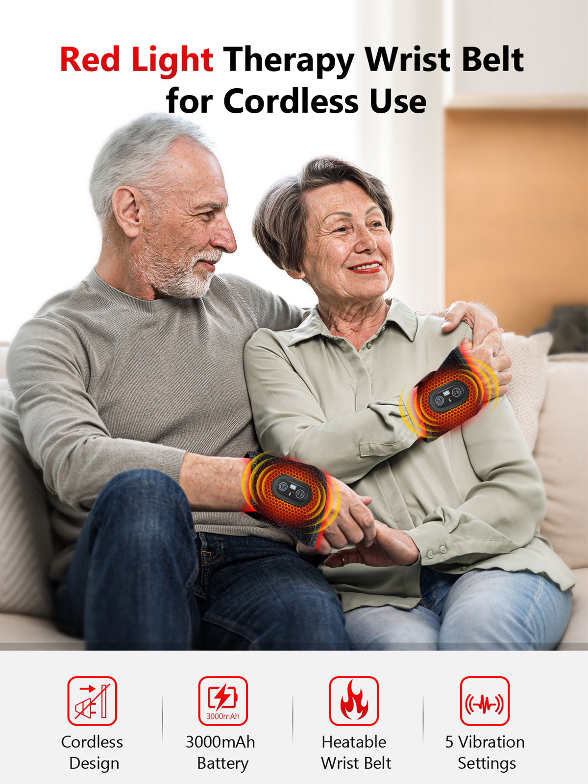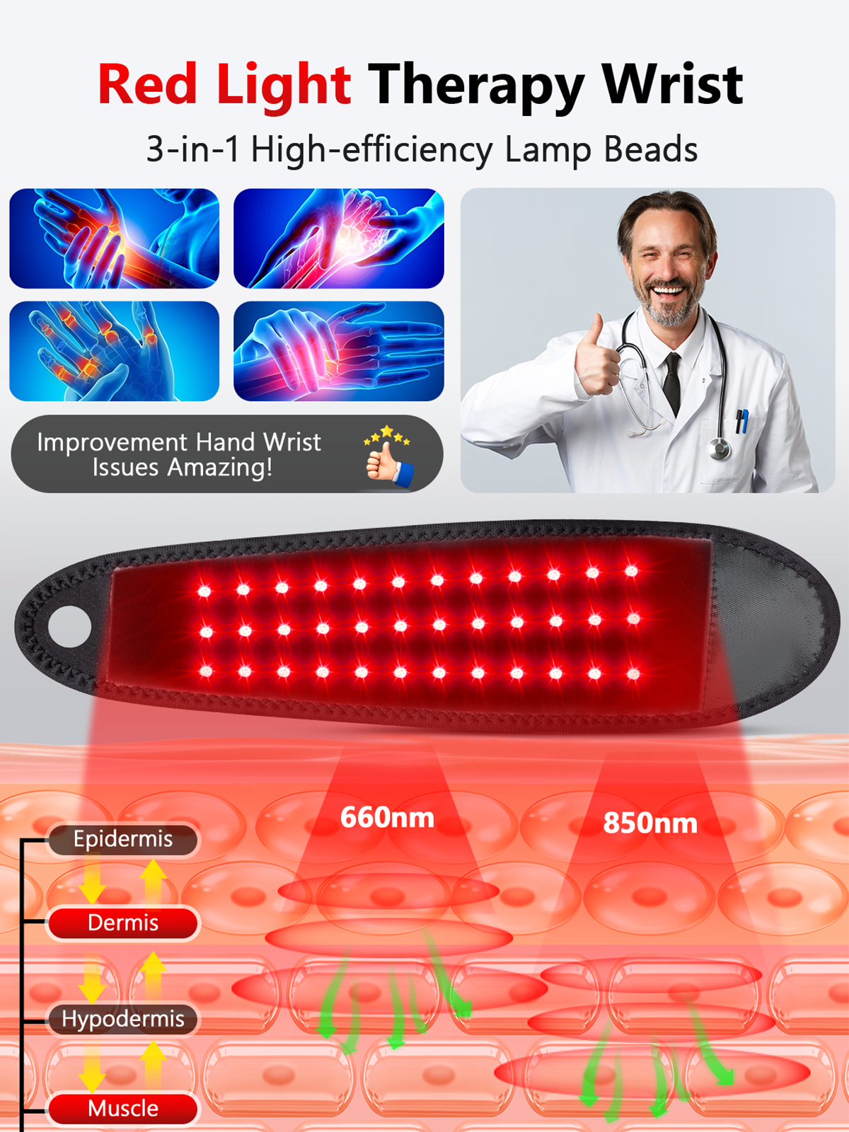 Advanced Therapy with Dual Light Technology: The wrist wraap boasts 72 pieces of 660nm red lights and 36 pieces of 850nm near-infrared lights. The red lights help relieve hand and wrist fatigue,improve blood circulation, and relax muscles, while the near-infrared lights penetrate deep into tissues to aid in wrist muscle and bone spur recovery, redducing inflammation and pain